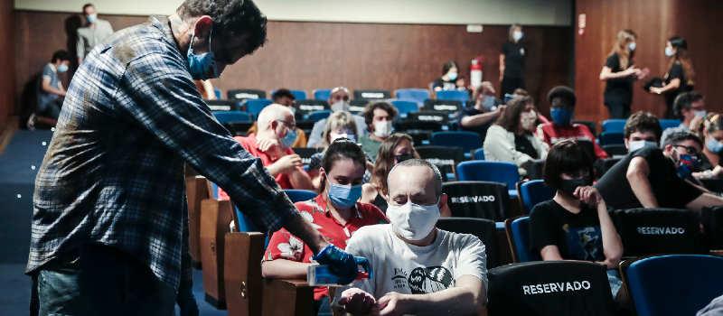 5 - Disponibilização de gel desinfectante por todo o Cinema São Jorge; 6 - Circuitos diferenciados de entrada e saída das sessões;